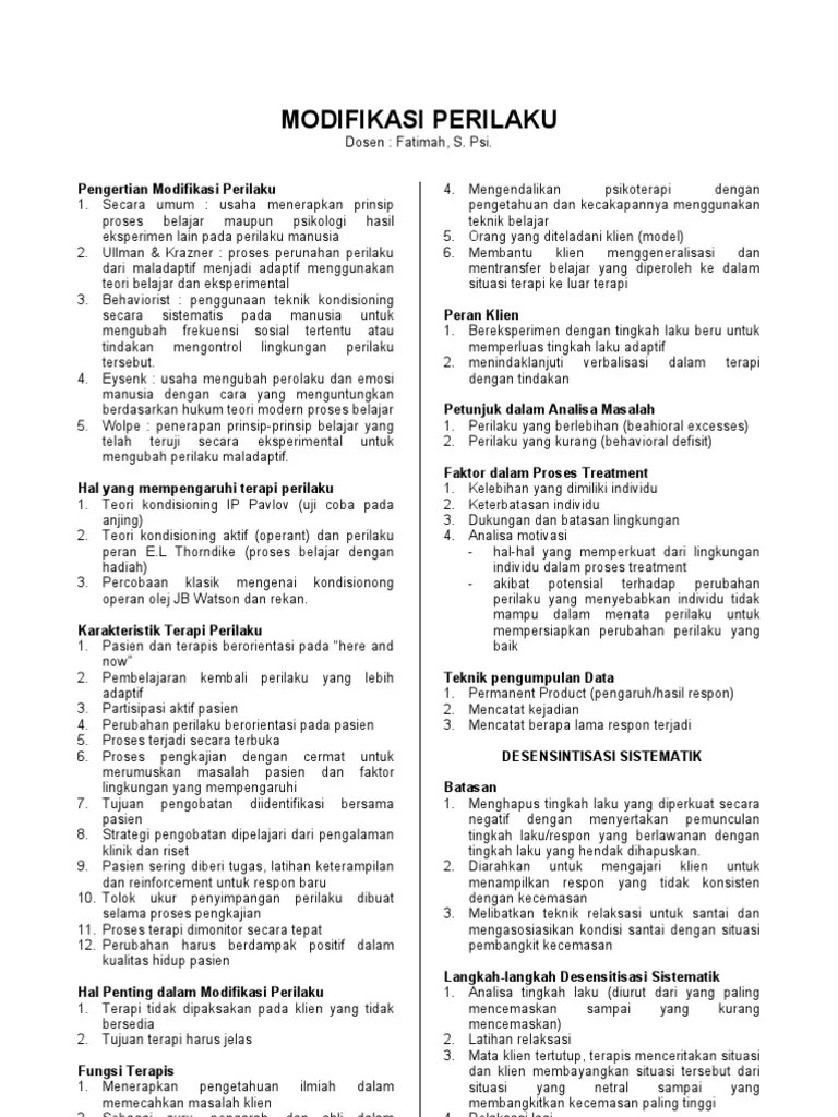 100 1 100 found this document useful 1 vote 2K views 23 pages. Intervensi Susulan Modifikasi Tingkah Laku akan dilakukan berdasarkan faktor-faktor seperti berikut. Modifikasi tingkah laku adalah 1 mementingkan faktor lingkungan 2 menekankan pada tingkah laku yang tampak 3 sifatnya mekanistik dan 4 mementingkan masa lalu.